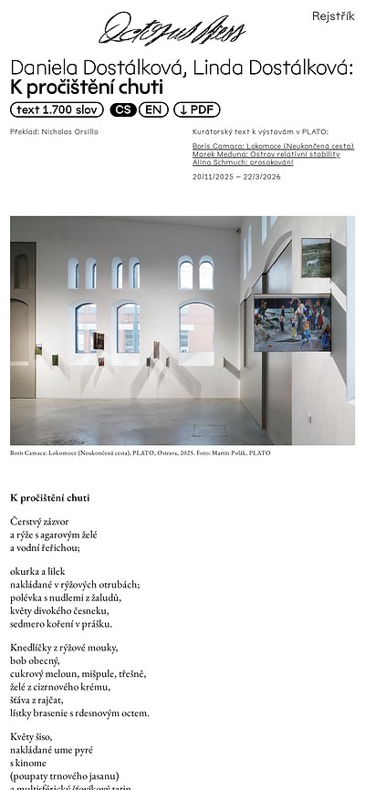 Iniciujeme vznik a prezentaci nových textů, přednášek, debat, multimediálních esejí, reportáží, uměleckých děl a dalších obrazových materiálů, které rozšiřují kontext výstav a programu PLATO.