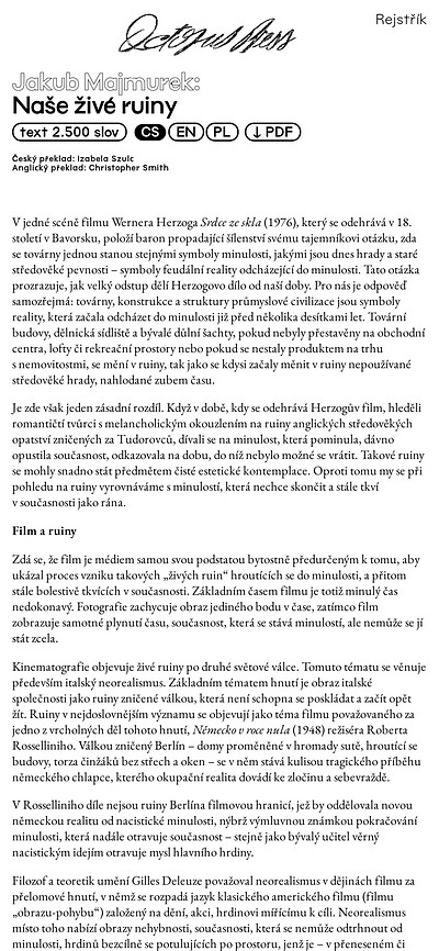 V souvislosti s kauzami, na něž nás Nadja s Iris upozorňují, následně studujeme knihu Simona Murrayho Performing Ruins. Píše v ní, že v současném zájmu o ruiny se odráží silný zážitek ontologické a epistemické nejistoty vznikající v důsledku procesů (klimatických změn, ekonomických otřesů a krizí, teroristických útoků a celkové globální atmosféry konfliktu), jež nás konfrontují s konečností modernity. Jak ovšem upozorňuje, ruiny, které v tomto procesu konce modernity vznikají, nejsou pouze místem oplakávání nebo místem historické reflexe, místem, v němž už nic nového nevzniká. Naopak, ruiny mají daleko od toho být ničím, případně se stát pouhou unipolární zprávou o historické tragédii. Ruiny se mohou stát místem subverze, místem, které pro svou mnohoznačnost nelze lehce kontrolovat, místem provokujícím a nespoutaným, místem, v němž mohou z emocionálního, psychologického, ale i materiálního rozkladu vzejít podmínky pro obnovu a život postavený na jiných základech. Ruiny mohou být místem pro sabotáž produktivity a setrvačnosti kapitalismu, jak hlásal projekt galerie PLATO15 Písek ve stroji. Ruiny mohou být místem optimismu a naděje.