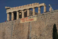 Druhou strategií je vytvořit prostřednictvím mediálních akcí, demonstrací a vyjednávání s politiky dostatečný tlak na banky, aby se s místními obyvateli domluvily na podmínkách, které by jim umožnily zůstat. Lidé kolem Tonii k tomu mimochodem využili historické ruiny, když na Akropoli vyvěsili banner na podporu iniciativy Hands off our homes (Ruce pryč z našich domovů) vyzývající k zastavení aukcí. Ruina Akropole tak slouží jako amplifikátor pozornosti na ruinaci, která probíhá právě teď, jíž je však upírána pozornost. I turistické ruiny se tak mohou stát místem sociálních bojů, nikoliv jen historického obdivu.